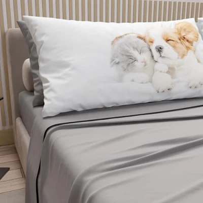 PETTI Artigiani Italiani Animal Bed Linen with Cats and Dogs in Cotton Pillowcases Digital Print, Single Sheet, Light Grey, 100% Made Italy