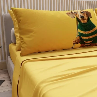 PETTI Artigiani Italiani Animal Bed Linen with Dogs in Cotton Pillowcases Digital Print, Double Bedsheets, Yellow Set, 100% Made Italy