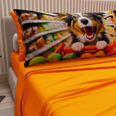 PETTI Artigiani Italiani Animal Bed Linen with Dogs in Cotton Pillowcases Digital Print, French Double Sheet, Orange Set, 100% Made Italy