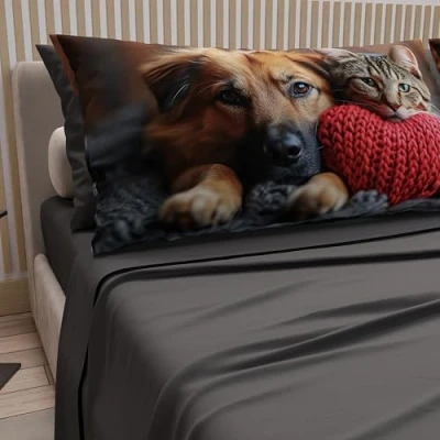 PETTI Artigiani Italiani Bed Linen Animals with Cats and Dogs in Cotton Pillowcases Digital Print, French Double Sheet, Grey Set, Made Italy