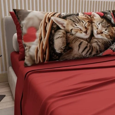 PETTI Artigiani Italiani Bed Linen Animals with Cats in Cotton Pillowcases Digital Print, Maxi Double Bedsheets, Red Set, 100% Made Italy