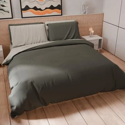 ️ A Refuge of Softness and Style: Every night becomes an ode to comfort with our double duvet cover, a perfect combination of sophistication and sweetness to the touch. The set includes a duvet cover (220 x 240 cm) and two pillowcases (63 x 63 cm), enveloping your bed in timeless elegance. The purity of a caress - 100% hypoallergenic microfibre: Created with the utmost attention to quality, our duvet cover is made from hypoallergenic microfibre (100 g/m²), a soft, velvety fibre that caresses the skin like a light breeze, ensuring a cool and safe rest night after night. Two Faces, One Harmony – Solid or Two-Tone – Express your style by choosing between the sobriety of solid colors or the versatility of reversible bicolors, perfect for transforming the atmosphere of your room with a simple gesture, like the flow of seasons. ❄️☀️ Winter warmth, cool in summer - a companion for every season: Thanks to its lightweight and breathable composition, our duvet cover ensures a perfect balance between protection and well-being, keeping you enveloped in warmth on cold nights and caressing you with freshness in the warmer months. Thoughtless beauty: Easy to wash, always perfect: made for those who love practicality without sacrificing elegance, the duvet cover is machine washable at 30°C, dries quickly and does not require ironing, keeping its softness intact over time.