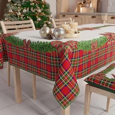 PETTI Artigiani Italiani Stain Resistant Rectangular Christmas Tablecloth, Kitchen Table Cover, Tartan Bow Design X6 Seater (140 x 180 cm) 100% Made in Italy
