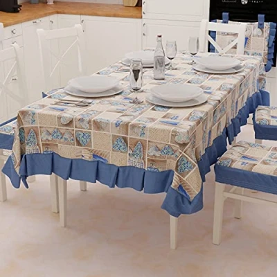 PETTI Artigiani Italiani Tablecloth, Plastic Table Cover with Ruffles, Cover, Waterproof Outdoor in Cotton Lidia Blue Design X6 Seats (140 x 180 cm) 100% Made Italy