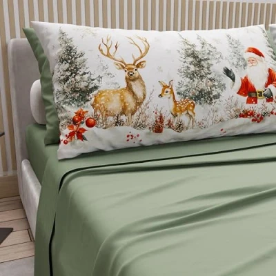 PETTI Italian Artisans Cotton Sheets with Christmas Digital Print Pillowcases, French Queen Size Sheets, Bed Set, Xmas 17 Green, 100% Made in Italy