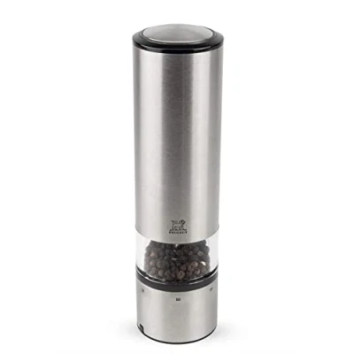 PEUGEOT ELECTRIC GRINDER: This touch-sensitive pepper grinder combines practicality, trendiness and performance. It comes with a vial filled with pepper. Conveniently, the vial cap serves as a funnel. AN ERGONOMIC PEPPER MILL: A true innovation, touch the body and head of the pepper mill simultaneously to activate the mechanism. Let the LED light guide you in the quantity of seasoning. A HIGH-TECH DESIGN: The stainless steel finish and acrylic reservoir of the Elis Sense u'Select mill give it a contemporary, almost futuristic look. Whether in the kitchen or on the table, it makes a statement. U’SELECT SETTINGS: Our patented system helps you select your desired grind. Twist to create your precise balance of flavour through six settings, from extra fine to very coarse. The two-stage grinding mechanism first effortlessly cracks and then grinds the pepper to the desired texture. PEUGEOT STANDS FOR EXCELLENCE: The name Peugeot embodies French know-how and has been appreciated by world-class chefs, gourmets and amateur cooks alike for over 200 years for its pepper, salt and spice mills, coffee grinders, its ceramic bakeware and its range of wine accessories. 2 year guarantee on the body Lifetime limited guarantee on the mechanism The pepper mill is equipped with a helix-shaped double row of steel teeth that guide and hold the peppercorns for a perfect grind Grind adjustment - Wheel of regulation for electric mills is under the grinding mechnism on electric grinders that are not equipped with the U'Select System Comes complete with batteries and new generation LED light