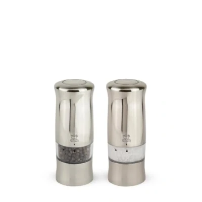 Peugeot Zeli Electric Salt & Pepper Mill Set Adjustable Grinders Battery Powered LED Light, Plastic with Brushed Metal Finish, 14 cm