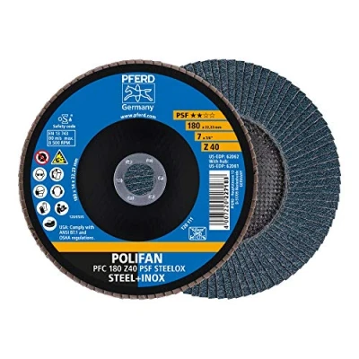 The Polifan fan disc is characterised by fast work progress and high economy thanks to aggressive cutting performance The serrated disc for steel and stainless steel has a good service life Conical flap sanding discs PFC are ideal for welding seam processing as well as chamfering and deburring thanks to the narrow grinding surface The 180 mm serrated disc is also suitable for low-performance angle grinders Box contents: 1 x Pferd Polifan fan disc PSF Steelox, with diameter 180 mm and bore 22.23 mm, conical design PFC, abrasive zirconium corundum Z, grain size 40, Weight: 0.0507 pounds, Manufacturer: Pferd