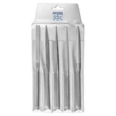 PFERD Offers a high-quality and extensive range of file and rasp sets - precision files from PFERD meet the highest demands on shape accuracy, cutting performance and service life Precise: needle file-like precision files in a narrow, fine, very pointed design – with Swiss cross cut 1 for medium precision machining Robust: the mobile phone file allows a higher working pressure thanks to its high robustness and can be used without a file handle due to its square rod Practical: the five mobile phone files are delivered in a plastic case that protects against dirt, corrosion and damage Box contents: 1 x Pferd mobile phone file set consisting of: 5 x mobile phone files (flat blunt, triangular, square, round, semi-circular) / with Swiss cut 1, length 215 mm / in protective plastic bag, Manufacturer: August Rüggeberg GmbH & CO. KG
