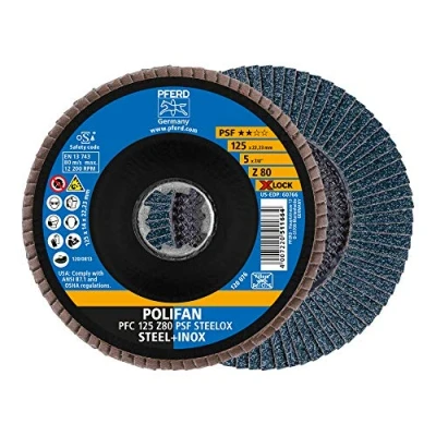 The conical Polifan fan disc is characterised by a quick work progress and high economy thanks to aggressive machining performance The flap disc PSF is also suitable for low-performance angle grinders and has a good service life Tools with X-LOCK can also be used on conventional angle grinders with thread M14 Box contents: 10 x POLIFAN fan discs PSF STEELOX from PFERD, with 125 mm diameter, conical design PFC; mounting: X-LOCK (22.23 mm), abrasive: zirconia corundum, grain size 80 International products have separate terms, are sold from abroad and may differ from local products, including fit, age ratings, and language of product, labeling or instructions., Weight: 3.086471668 pounds, Manufacturer: August Rüggeberg GmbH & Co. KG