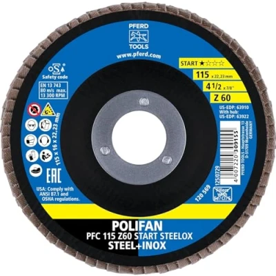 Universally applicable: the conical flap disc can be used universally on steel and stainless steel (INOX) High economy: the flap disc is characterised by a high economy thanks to solid service life Fast work progress: the high machining performance allows fast work progress Flexible use: the Polifan fan disc is also suitable for low-performance angle grinders Box contents: Polifan Z-box – 10 x PFERD Polifan fan disc / with 115 mm diameter / conical design PFC/abrasive: zirconia corundum Z / grain size 60, Manufacturer: August Rüggeberg GmbH & Co. KG