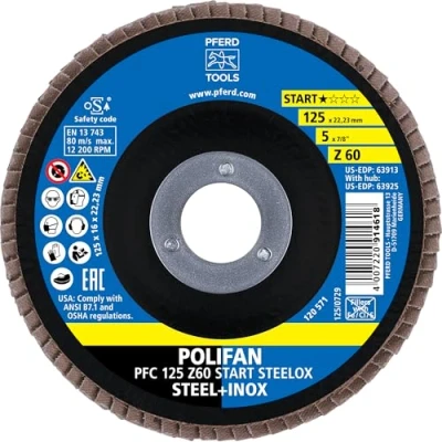 Universally applicable: the conical flap disc can be used universally on steel and stainless steel (INOX) High economy: the flap disc is characterised by a high economy thanks to solid service life Fast work progress: the high machining performance allows fast work progress Flexible use: the Polifan fan disc is also suitable for low-performance angle grinders Box contents: Polifan Z-box – 10 x PFERD Polifan fan disc / with 125 mm diameter / conical design PFC/abrasive: zirconia corundum Z / grain size 60, Manufacturer: August Rüggeberg GmbH & Co. KG