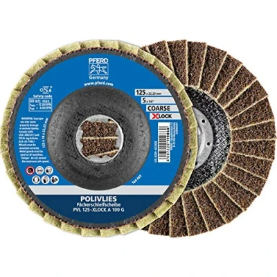 Polifleece fan discs are characterised by their high economy thanks to a high grinding performance and service life, while at the same time optimal contour adjustment due to high flexibility The sanding disc produces a consistently high surface quality over the entire service life, as constantly new, sharp abrasive is released Tools with X-LOCK can also be used on conventional angle grinders with M14 thread Box contents: 5 x polifleece flap discs from Pferd / with 125 mm diameter / holder: X-Lock (22.23 mm) / abrasive: corundum A / grain size 100, coarse International products have separate terms, are sold from abroad and may differ from local products, including fit, age ratings, and language of product, labeling or instructions., Weight: 1.1904962148 Pounds, Manufacturer: August Rüggeberg GmbH & Co. KG