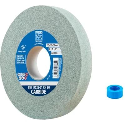 The carbon sanding disc (EAN: 4007220038109) is suitable for use on hard materials and impresses with its long service life, high dimensional stability and high grinding performance Thanks to the integrated reducing sleeve, the ceramic-bound sanding disc can also be mounted on sanding stand spindles with 32 mm diameter The straight grinding wheel can be used for deburring, sharpening and edge processing (chamfering, rounding) of carbide tools Design: ceramic binding, silicon carbide green, hardness grade: J, composition density: 7 Box contents: 1 x Sanding Disc Carbide from Pferd with 175 mm diameter and 25 mm width, bore diameter: 51 mm, abrasive: silicon carbide (CN), grain size: 80 + reducing sleeve, Weight: 2.436525 pounds, Manufacturer: August Rüggeberg GmbH & Co. KG
