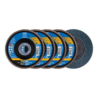 Steelox: The set contains four Polifan fan discs for universal use on steel and stainless steel (INOX) Industrial quality: PFERD flap discs allow fast work progress thanks to good machining performance Good service life: the tools impress with their high efficiency thanks to good service life Conical: conical flap discs PFC are ideal for welding seam processing as well as for chamfering and deburring thanks to the narrow grinding surface Box contents: 1 x PFERD PSF Steelox serrated disc set consisting of: 4x Polifan fan disc / with diameter 125 mm, bore 22.23 mm, abrasive zirconia corundum Z, Manufacturer: August Rüggeberg GmbH & Co. KG