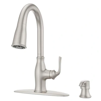 KITCHEN FAUCET WITH PULL DOWN SPRAYER – Advanced spray head docking system; elegant forward handle design underscores ergonomic function and helps where space behind the faucet is limited; includes decorative deckplate and coordinating soap dispenser ADVANCED SPRAY HEAD DOCKING – MagnePfit uses powerful magnetic docking to keep your spray head firmly secured; Auto-Align ensures your spray head aligns correctly all on its own PULL DOWN SPRAYER – Features toggle button to select spray or stream modes conveniently in the palm of your hand; wipe clean nozzles allows you to wipe away mineral deposits with the swipe of a finger SPOT DEFENSE FINISH – Spot Defense provides extra protection to help prevent the daily buildup of fingerprints, smudges, and water spots; looks cleaner longer than other faucet finishes; less cleaning and wiping needed SOLOTILT SOAP DISPENSER – Features a forward tilting pump head that lets you dispense soap with the flick of your thumb. A dirty dish in one hand, sponge in the other? No problem. SoloTilt has you covered.NO MORE LEAKS – Features Pforever Seal advanced ceramic disc valve technology that will never leak; also includes 36-inch integrated PE-RT supply lines with female fittings; no need to purchase separate water-supply connection lines., Weight: 8.5 Pounds, Manufacturer: Pfister