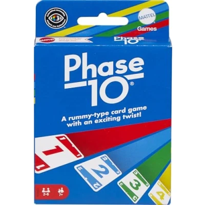 Phase 10 is the Rummy-type card game with a twist! Be the first player to complete 10 varied phases with two sets of three, one run of seven, or seven cards with the same color. “Wild” and “Skip” cards add excitement and deliver game-changing moments. Phase 10 game is fun and enjoyable for the whole family! Includes 108 cards and instructions., Manufacturer: Mattel