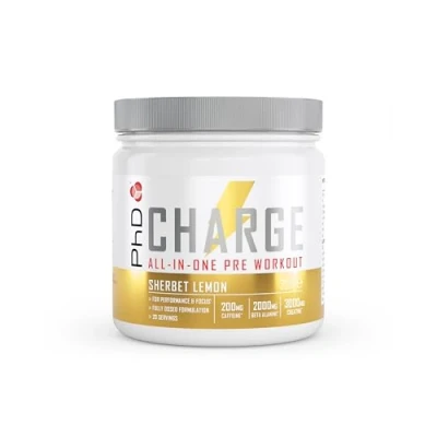 PhD Charge, All in One pre Workout Powder with Creatine for Women and Men, Rich Beta Alanine, High Caffeine Workout, Sherbert Lemon Flavour, 20 Servings Per 300g Bottle
