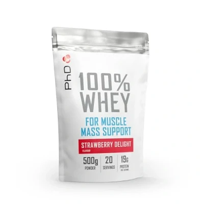 Maximise your performance with PhD 100% whey protein powder; sourced from grass-fed cows, rich in branched-chain amino acids (BCAAs) and L-Glutamine content and improved absorption, it’s easy on the digestive system making it ideal for serious athletes and fitness enthusiasts Get the most out of every workout; our PhD protein powder is low in carbs, low in fat, and less than 100 kcal per serving; perfect for those seeking lean muscle gains without extra calories, great as a pre or post-workout recovery drink to help you stay on track with your diet Delicious and easy to mix: our tasty Strawberry protein powder can be used as a protein shake, or a meal replacement shake, fitting seamlessly into your active lifestyle and making it easier to stick to your protein routine; just add 1 scoop (25g) to 200ml of ice-cold water and shake or blend for 10 seconds Convenient on-the-go nutrition: our new 500g size offers the perfect amount of high quality whey protein powder Strawberry Delight, whether you're at the gym or on the move, a great choice for anybody looking for an easy way to increase their daily protein intake Sustainable and Environmentally Friendly: PhD Nutrition’s commitment to industry-leading technology and recycling options for all products supports environmentally conscious practices to allow you to make a positive impact on the environment while taking care of your fitness goals