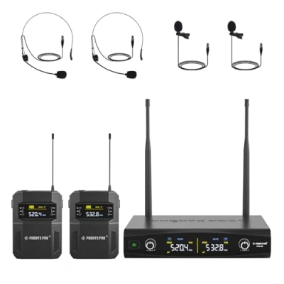 Phenyx Pro UHF Wireless Microphone System w/ 2x30 Frequencies, Metal Cordless Mic Set, 2 Bodypacks & Headsets/Lapel Microphones for Speaking, Singing, Church, DJ (PTU 52 2B)