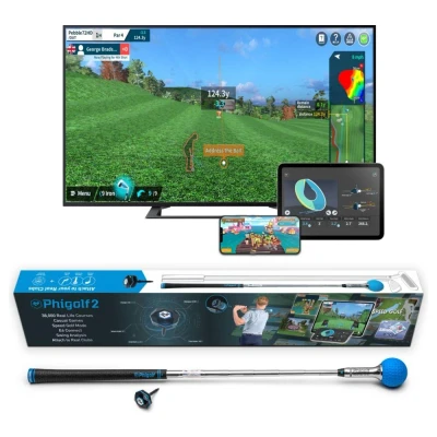 Phigolf Swing Analysis: The Phigolf Swing Analysis Motion Sensor lets you improve your golf skills while enjoying a range of fun games through the app. Whether you're a beginner or a seasoned pro, Phigolf 2 is ideal for get-togethers—from BBQs and birthday parties to pizza nights or vacations—adding a fun activity everyone can enjoy. Golf for Everyone: Our lightweight 9.8g USB-C motion sensor provides an authentic golfing experience. Just pair it via Bluetooth, attach it to your swing stick or club, and start playing. Phigolf is user-friendly, suitable for all skill levels, and supports multiplayer sessions for up to four players. Play Top Golf Courses: Access 58 golf courses, including 9 classic and 8 HD courses through the Phigolf app, plus 41 additional options with E6 Connect. Enjoy the experience of playing top courses from one device—offering more than any other simulator! Over 38,000 Courses Worldwide: Play on over 38,000 courses around the world using Phigolf. Easily search for nearby courses or find a favorite. Enjoy the experience of playing courses from around the globe—all from the comfort of your own home. Use Your Own Clubs: Attach the Phigolf sensor to your own clubs and swing real balls for a truly authentic practice experience. Our upgraded 27.6-inch, 500g steel shaft swing stick with a replaceable grip is ideal for small spaces and replicates the feel of a real club. Just make sure to set up a net for safe practice!