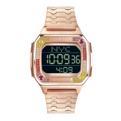 This Philipp Plein Hyper $hock Digital Watch for Unisex is the perfect timepiece to wear or to gift. It's Rose Gold Rectangular case combined with the comfortable Rose Gold Stainless steel watch band will ensure you enjoy this stunning timepiece without any compromise. Operated by a high quality Quartz movement and water resistant to 5 bars, your watch will keep ticking. This casual and modern watch is perfect for all kind of casual activities, indoor activities or daily use, it's also a great gift for family and friend. -The watch has a calendar function: Day-Date, Stop Watch, Timer, Alarm, Light High quality 20 cm length and 22 mm width Rose Gold Stainless steel strap with a Fold over with push button clasp Case Measurement: 40x44 mm,case thickness: 12 mm, case colour: Rose Gold and dial colour: Black