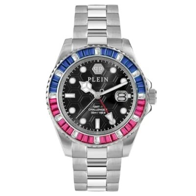 Prepare to be captivated by the Philipp Plein GMT-I Challenger Baguettes, a watch that transcends conventional timekeeping to become a statement of sheer opulence, impeccable style, and unmatched sophistication. This Analogue watch has a calendar function: Date as well as Luminous Hands and Luminous Numbers High quality 21 cm length and 21 mm width Silver Stainless steel strap with a Deployment clasp Case diameter: 44 mm,case thickness: 11 mm, case colour: Silver and dial colour: Black Water resistant: 5 bars -Weight: 184 g The watch is delivered in an original gift box and has a warranty of 2 years