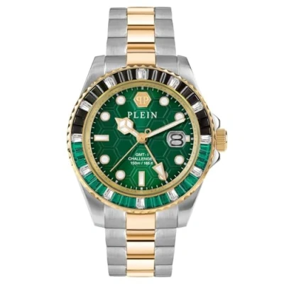 Prepare to be captivated by the Philipp Plein GMT-I Challenger Baguettes, a watch that transcends conventional timekeeping to become a statement of sheer opulence, impeccable style, and unmatched sophistication. This Analogue watch has a calendar function: Date as well as Luminous Hands and Luminous Numbers High quality 21 cm length and 21 mm width Multicolour Stainless steel strap with a Deployment clasp Case diameter: 44 mm,case thickness: 11 mm, case colour: Multicolour and dial colour: Green Water resistant: 5 bars -Weight: 184 g The watch is delivered in an original gift box and has a warranty of 2 years