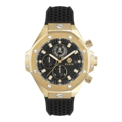 Plein Chrono Royal 46 mm relits its dominance this season. This Chronograph watch has a calendar function: Date as well as Stop Watch , Luminous Hands and Luminous Numbers High quality 21 cm length and 17 mm width Black Silicone strap with a Buckle Case diameter: 46 mm,case thickness: 13 mm, case colour: Gold and dial colour: Black Water resistant: 5 bars -Weight: 133 g The watch is delivered in an original gift box and has a warranty of 2 years