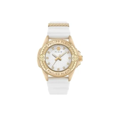 The Plein Majesty is ready to conquer the feminine universe. This Analogue watch has a function: Luminous Hands High quality 19 cm length and 20 mm width White Silicone strap with a Buckle Case diameter: 38 mm,case thickness: 9.5 mm, case colour: Gold and dial colour: White Water resistant: 5 bars -Weight: 84 g The watch is delivered in an original gift box and has a warranty of 2 years