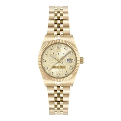 Philipp Plein slays the SS25 season with the iconic Date Superlative, now transformed into a statement-making pair watch. This Analogue watch has a calendar function: Date as well as Luminous Hands High quality 19 cm length and 16 mm width Gold Stainless steel strap with a Deployment clasp Case diameter: 28 mm,case thickness: 8.4 mm, case colour: Gold and dial colour: Champagne Water resistant: 5 bars -Weight: 76 g The watch is delivered in an original gift box and has a warranty of 2 years
