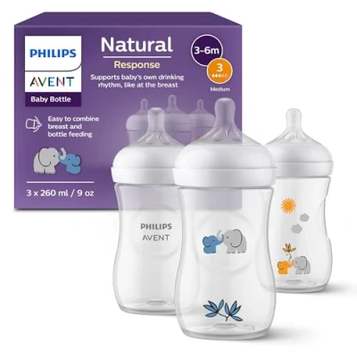 The Natural Response Bottle supports your baby's natural drinking rhythm: your baby controls the pace of the milk flow, just like during breastfeeding Baby bottles designed with a unique opening and tip that only release milk when your baby actively drinks: when pausing to swallow and breathe, no milk flows No-drip teat design helps prevent lost milk from the tip of the baby bottle, giving you peace of mind at home and on the go; the bottle teat comes in Flow 3 Anti-colic valve for your well-being and your baby's well-being: it keeps air away from your baby's tummy during feeding to reduce colic and discomfort The set includes: 3 x 260 ml Natural Response Bottles with T3 (1 m+ teats)