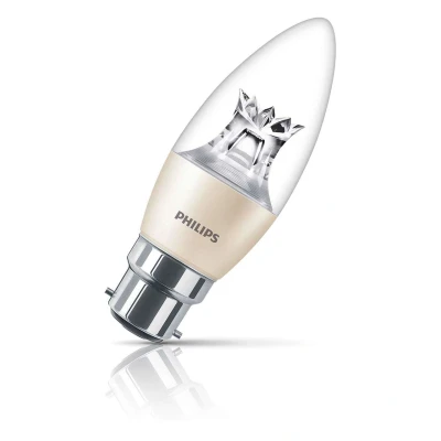 Illuminate your space with elegance using the Philips Master 5.5W LED Candle Light Bulb. Combining classic candle-shaped aesthetics with advanced LED efficiency, this dimmable bulb offers a stylish and energy-saving alternative to traditional incandescent candles.Consuming just 5.5 watts, this LED candle bulb provides the same brightness as a 40W incandescent bulb and boasts an impressive lifespan of up to 25,000 hours. The clear finish showcases the LED technology and delivers a bright, even light that mimics the warm, inviting glow of traditional incandescent bulbs.Emitting a warm white light at 2700K, this bulb creates a cosy atmosphere perfect for any setting. The innovative DimTone technology allows the light output to transition smoothly from 2700K to 2200K as the bulb is dimmed, replicating the warmer glow of traditional incandescent lighting and enhancing the ambience.With a high CRI of 90, this bulb ensures exceptional colour accuracy, making colours appear more vibrant and true to life. Ideal for chandeliers, wall sconces, and decorative fixtures, the BC-B22d bayonet (22mm) base provides easy installation.Choose the Philips Master LED Candle Light Bulb for a refined, dimmable lighting solution that combines energy efficiency, long-lasting performance, all with the added versatility of DimTone technology and a classic candle shape.