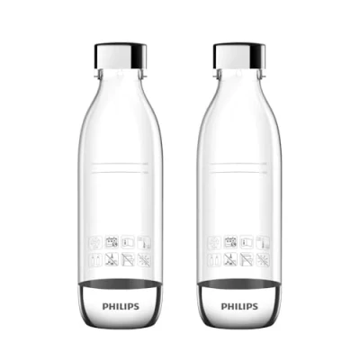 SLEEK DESIGN: Transparent bottles with brushed stainless steel cap and base finish that easily fit into your kitchen and home. SAFETY GUARANTEED: Built-in safety valve, BPA-free material and QuickTwist design. ENVIRONMENTALLY FRIENDLY: One CO₂ bottle lasts for up to 60 litres of delicious sparkling water, replacing hundreds of disposable plastic bottles. Sparkling water can be carbonated at any time. COMPATIBILITY: Compatible with Philips Water Station ADD5962 and Philips Soda Makers ADD4902. For best results, it’s recommended to use Philips sodamakers exclusively with Philips bottles to ensure safe and reliable performance. Compatible with new Quick Twist system