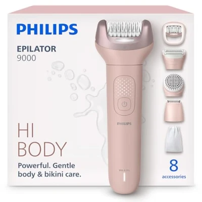 Efficient hair removal and full body care in one set: enjoy your self-care moments at home with Philips Series 9000 showerproof epilator set, more than just a hair remover Smoothness for up to 4 weeks: Philips' most efficient epilator and the world's first epilator with ProGuide featuring 360° visibility for efficient and gentle results after epilating Powerful performance meets gentle care: removes hair as short as 0.5 mm with 32 ceramic hypoallergenic tweezers that glide over the skin; 100% showerproof from the shower to the sink, wet or dry use Bye skin irritation: reveal softer skin and prevent ingrown hairs with the gentle body exfoliation brush; complete your routine with an extra shaver head and trimming comb designed for sensitive areas Shaving head designed to be gentle: less burning, less redness and more comfort for your skin³; prevent nicks and cuts and enjoy a smooth, gentle shave Effortless use: 60 min. on one charge, cord-free; new design comes with matt finishing and non-slip patterns for improved grip This set includes: 1x epilator head, 1x ProGuide, 1x shaving head, 1x trimmer comb, 1x bikini trimmer, 1x bikini trimmer comb, 1x body exfoliation brush, and more - see the "what's in the box" section