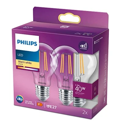 Lights.coLED filament lamp E27 4.3 W EyeComfort, 2,700 K, double pack This lamp is a replacement for a 40W incandescent lamp and can be used particularly well in open luminaires thanks to the filament technology and clear glass. - the LED lamp meets the EyeComfort criteria developed by Philips and provides an eye-friendly light - advantageous 2-pack
