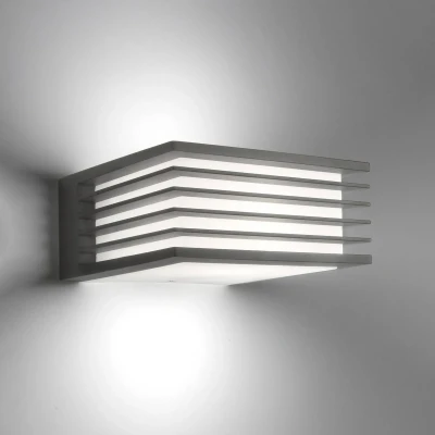 Lights.coShades myGarden outdoor wall lamp with E27 socketThis square-shaped outdoor wall lamp made of injection-molded aluminum and a plastic diffuser can also be equipped with energy-efficient and long-lasting LED bulbs, because it is equipped with an E27 socket. Through the opal white diffuser, the light radiates upwards and downwards, while the light radiating sideways and forwards is glared by the slats.