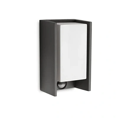 Outdoor wall lamp Bridge myGarden with motion detectorAnthracite aluminum injection molding and a diffuser of white plastic are the components of the outdoor wall lamp Bridge from the myGarden range of Philips. The frame frames the diffuser on the side. At the bottom of the frame, a motion detector has been integrated so that the light turns on automatically when it is needed. The luminaire is equipped with an E27 socket and can be fitted with many types of bulbs, energy-efficient and long-life LED lamps are recommended.- Angle of coverage 100°- Range of coverage 10 m- Recommended maximum mounting height 1.80 m- Light duration adjustable from 1 min to 6 min