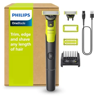 OneBlade Technology: fast-moving cutter (12,000x min) efficient even on longer hairs, the Dual Protection System with glide coating and rounded tips for higher comfort Innovative 360 blade: it can flex in all directions to enable constant skin contact and control, easily trim and shave with fewer passes and greater comfort Designed to cut hair not skin: trim to an even length with 5in1 comb (1-5 mm), create precise edges with dual-sided blade, and shave off any length of hair easily Body hair trimmer and shaver: trim and shave in any direction with the click-on body comb (3 mm) and skin guard for an extra layer of protection on sensitive areas Personalized experience: with free Philips Daily Care app, know when to switch up a blade or charge up the battery and get recommendations based on your routine The set includes: 1 x Philips OneBlade 360 with Connectivity, 2 x 360 Blades, 1 x 5-in-1 adjustable comb (1–5 mm), 1 x body kit with 3 accessories, 1 x USB-A cable. To charge the product, only use a certified USB adaptor with A-type connector and output rating 5 V, ≥ 1 A. * Packaging received may vary from product image, as a result of an ongoing packaging update.