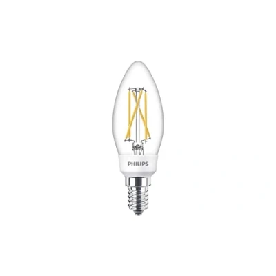 E14 candle LED bulb Philips SceneSwitch 4.3W with filament look This SceneSwitch bulb with filament look and clear glass bulb from Philips offers flexible lighting. Using a standard light switch, the light can be switched between three different levels or lighting moods without the need for a dimmer. As the brightness decreases, the light colour also becomes warmer in levels 2 and 3. The LED bulb is therefore an ideal light source for lighting in living areas. The memory function saves the last selected setting. This light source meets the EyeComfort criteria developed by Philips. It produces light that is easy on the eyes. Technical data - Comparative value: 40 watts - Light colours and lumen values in the three selectable levels: Level 100% 2,700 K - 470 lumens, level 40% 2,500 K - 180 lumens, level 10% 2,200 K - 90 lumens