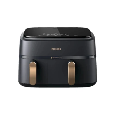 Enjoy your meals just the way you like them.Discover the dual-basket air fryer from Philips, capable of timing your meal so that two dishes are ready at the same time! There's a large drawer for family-sized mains, and a smaller one for sides or one-person meals.CRISPY, TENDER AND EVENLY COOKED THANKS TO "RAPIDAIR PLUS"No more burning or undercooking! The patented "RapidAir Plus" technology circulates hot air around and through the ingredients, ensuring that your homemade meals are cooked evenly both inside and outside.2 DRAWERS TO SUIT ANY MEALUse any of the two drawers: the large one is perfect for family-sized mains, while the smaller one is suited great for sides, veggies, and delicious snacks.9-LITRE CAPACITYPrepare up to 1.5 kg of Brussels sprouts or a 1.5-kg chicken in one go!TIME YOUR COOKING TO PERFECTIONSynchronise the cooking times in the two drawers so that all of your food is ready to serve at the exact same time.COPY FUNCTIONSet identical cooking times and temperatures in both baskets at the touch of a button.GET THE MOST OUT OF YOUR AIR FRYER WITH ""HOMEID""Discover hundreds of mouthwatering recipes and step-by-step instructions in the "HomeID" app. TOUCH SCREEN WITH 8 PRESETSNo more guesswork! Using the convenient touch screen, you can choose from pre-set temperatures and cooking times for fresh fries, frozen fries, chicken, meat, veggies, fish, and more.UP TO 90% LESS FATEnjoy delicious, guilt-free food without compromising on taste.SAVE UP TO 70% OF ENERGY Save up to 70% of energy compared to a standard oven.FASTER THAN AN OVENDiscover unbeatable speed! Save time by serving delicious meals in as little as a few minutes.DISHWASHER-SAFENo scrubbing or soaking needed! The baskets of this air fryer are dishwasher-safe.