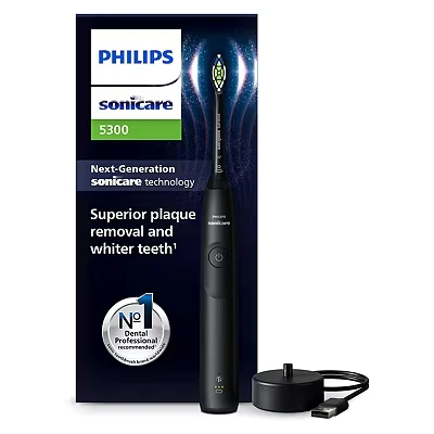 Improve your oral health: the Philips Sonicare 5300 helps you achieve up to 7 x more plaque removal¹ and removes surface stains for a radiant, whiter smile Improve your oral health: the Philips Sonicare 5300 helps you achieve up to 7 x more plaque removal¹ and removes surface stains for a radiant, whiter smile Next-Generation Sonicare Technology: enjoy a delightful brushing experience and a new level of oral care with precisely 62,000 bristle movements per minute for a consistent clean, even in hard-to-reach areas Personalise your cleaning with 2 intensity levels to meet your healthcare goals: choose a boost of cleaning power with the high setting or a gentle yet thorough clean with the low setting Hard on plaque, gentle on gums: protect your gums with the intelligent pressure alert, which gently pulses while reducing vibration when you brush too hard Ease into brushing: the EasyStart feature gently increases brushing power over your first 14 brushing sessions to help you get used to your Philips Sonicare toothbrush To ensure that you are completely satisfied with your purchase, the Philips Sonicare 5300 rechargeable toothbrush comes with a 2-year warranty and a 30-day money-back guarantee The set includes: 1 x 5300 sonic electric toothbrush, 1 x W2 Optimal White brush head, 1 x charger. Packaging may vary