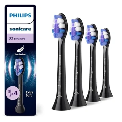 AmazonGentle yet effective cleaning of sensitive teeth and gums: this toothbrush head features a unique design with long, thin, ultra-soft bristles that keep every brush stroke kind Remove up to 10x more plaque than a manual toothbrush in hard-to-reach areas with more than 3,000 densely packed bristles designed to provide thorough yet gentle brushing Proven Sonicare technology: deep and gentle cleaning with up to 62,000 bristle movements; Sonicare fluid action supports cleaning by driving fluid deep between teeth and along the gumline Click-on design: Philips Sonicare S2 Sensitive brush heads fit all Philips Sonicare handles⁴ You'll know when it's time to change the brush head thanks to BrushSync replacement reminder (compatible handles) that tracks how often and how hard you brush, and when blue bristles turn white 70% of the plastic in this brush head is bio-based²; paper-based recyclable packaging³ The set includes: 4x S2 Sensitive brush heads, black