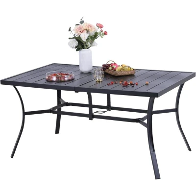 AmazonAll Weather: the garden table is made of steel and is therefore stable and durable. Power e-coating makes it rust proof. Lightweight and easy to maintenance. Perfect for outdoor use 6-person Garden Dining Table:150x90x73cm size,space saving design, offer space for 6 people. you can enjoy dinner with family and friends in the Spring and Summer Classical Design: smooth black outlines structure, space saving design. Let the outdoor table join your garden furniture sets in the yard A hole for parasol or light: there is a hole(diameter 4cm) with cover in the middel of the patio table for parasol or lights Easy to keep clean, just wipe with a damp cloth This outdoor dining table comes as 1 package: 96x1x18cm, 20.3kg package. Assembly needed