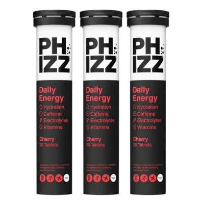 NEW PHIZZ DAILY ENERGY - Unlock your maximum energy with our unrivalled boost, featuring 75mg of caffeine blended with natural guarana, smarter hydration, and 16 essential nutrients. Delicious cherry flavoured effervescents tablets. TRIPLE ACTION SYSTEM - Our triple-action system of caffeine, B-vitamins, and rehydration provides both fast and sustained energy, while our Phizz formula hydrates smarter, providing 3x faster hydration than water and 4 key electrolytes for peak physical and mental performance. VITAMINS & MINERALS - Phizz’ scientific formula combines hydration and electrolytes with 16 high-dose ingredients, including B Vitamins, Vitamin C (300% of your daily dose), powerful antioxidants and the 4 key electrolytes you lose through sweat (sodium, potassium, magnesium and zinc). PROFESSIONAL ATHLETES - Phizz helps fuel over 50 Pro Sports sides including Premier League & Championship Football teams (including Liverpool, Fulham FC, QPR and Leeds United), Saracens Rugby, Nottinghamshire Country Cricket Club and West Indies Cricket. Phizz can help recovery time after exercise because it contains electrolytes, lost via sweat during exercise, which are vital for cells, muscles and organs to work properly. DIRECTIONS & USE - Simply dissolve 1 tablet in a glass or water bottle. Phizz is ideal for daily hydration and health goals, pre/post exercise, hot climates, travel and jet lag. Phizz is also a great caffeine-free alternative to coffee to avoid fatigue at work or throughout the day. Do not exceed the recommended daily dose of 4 tablets per day. Phizz is a food supplement and not not a substitute for a varied, balanced diet and healthy lifestyle.