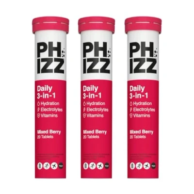 NEW AND IMPROVED 1 TABLET FORMULA – Our unique and improved Rehydration + Vitamin formula rapidly hydrates your body up to 3 times faster than just water alone. Delicious mixed berry flavoured effervescent tablets. VITAMINS & MINERALS - Phizz’s 3-in-1 scientific formula combines hydration and electrolytes with 18 quality high-dose ingredients, including vitamin A, B Vitamins, Vitamin C (375% of your daily dose), powerful antioxidants and the 4 key electrolytes you lose through sweat (sodium, potassium, magnesium and zinc). Helping release natural energy to reduce tiredness while promoting performance, brain function and supporting your immune system. PROFESSIONAL ATHLETES - Phizz helps fuel over 50 Pro Sports sides including Premier League & Championship Football teams (including Liverpool FC, Fulham FC, QPR and Leeds United), Saracens Rugby, Nottinghamshire Country Cricket Club and West Indies Cricket. Phizz can help recovery time after exercise because it contains electrolytes, lost via sweat during exercise, which are vital for cells, muscles and organs to work properly. DIRECTIONS & USE - Simply dissolve 1 tablet in a glass or water bottle. Phizz is ideal for daily hydration and health goals, pre/post exercise, hot climates, travel and jet lag. Phizz is also a great caffeine-free alternative to coffee to avoid fatigue at work or throughout the day. Do not exceed the recommended daily dose of 4 tablets per day. Phizz is a food supplement and not not a substitute for a varied, balanced diet and healthy lifestyle. "PHIZZ QUALITY - Phizz is scientifically formulated and made from high quality ingredients. Our multivitamin and electrolyte tablets are vegan, halal, gluten free, soy, nut and GMO-free. Zero artificial flavours or colourings. Our tubes are recyclable and plastic positive, this means for each tube of Phizz sold, approximately 1.5 times its weight in plastic waste is collected, recycled and prevented from entering our oceans. "