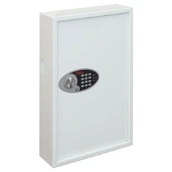 Heavy duty, high security key safe. Programmable electronic lock with key override (2 keys supplied). Can be bolted to the wall with included fixings. High quality, scratch resistant white paint finish. Capacity: 144 keys.
