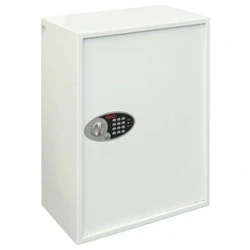 Key deposit slot allows keys to be deposited without opening the safe. Secure electronic lock. 300 hooks. Heavy duty steel constructed with scratch resistant painted finish. Concealed hinges and twin live locking bolts. Supplied with wall fixing bolts.