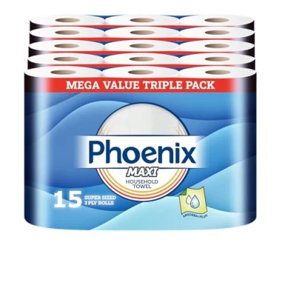 Phoenix Maxi 3 Ply Kitchen Rolls 15 Super Sized (5 Packs of 3) Strong, Ultra Absorbent, Soft Paper Towels for Household Cleaning, Spills, and Wiping Quilted Texture Bulk Value Case
