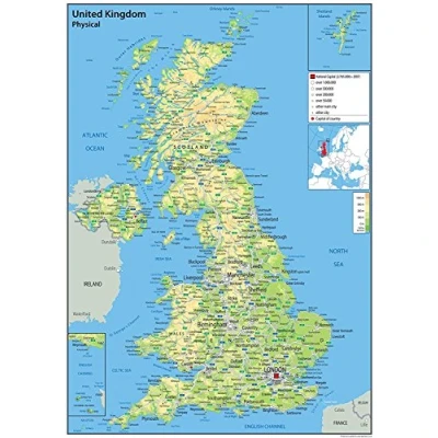 The United Kingdom, containing England, Scotland, Wales and Northern Ireland, stands as an island nation in northwestern Europe. England, where famous figures such as Shakespeare and The Beatles hail from, plays host to the influential capital city of London. This same English land is also where the ancient, Neolithic Stonehenge and the Roman spa of Bath reside, as well as the centuries-old universities of Oxford and Cambridge. Our Physical Map of the United Kingdom is vibrant and informative, with easy-to-read text and bright colours. Including capital cities, rivers, major roadways, towns, surrounding bodies of water and mountain ranges. The physical aspects such as land elevation are clearly showed and makes for an attractive map either for the home, office or school, for display on a wall or for desk work. Size - 100 x 70 cm. Printed onto quality paper and finished with a gloss laminate.